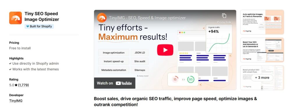 - What it does: TinyIMG is an all-in-one SEO and speed optimization app built to make your Shopify store lightning-fast and search engine-friendly. It automatically compresses and optimizes images, improves ALT texts and filenames, and even generates SEO metadata using AI. The app also helps fix 404 errors, manage redirects, and enhance structured data – all from one dashboard.