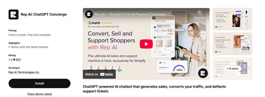 - What it does: Rep AI is a ChatGPT-powered sales and support chatbot designed to convert your Shopify traffic into paying customers. It uses advanced Behavioral AI to engage shoppers at the right moment and Conversational AI to answer questions, recommend products, and guide customers through checkout – all while staying true to your brand’s tone and style.